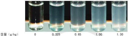 甜蜜素經酸化后與顯色試劑反應,生成一種乳白色沉淀,穩定性較好,而且混濁度與溶液中甜蜜素的含量成正比。