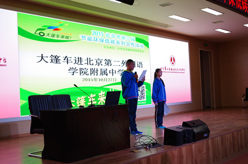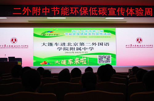 由北京市發展改革委員會主辦的2015北京市第三屆節能環保低碳系列宣傳活動“低碳大篷車”于2015年10月27日走進北京第二外國語學院附屬中學。