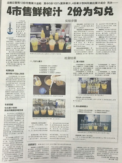 檢測結果:除1號、12號樣品檢測結果不符合國家標準外,其他樣品均達到國家標準。1號、12號樣品均為路邊小店購買,北京智云達提醒消費者選購果汁類飲品最好鮮榨的,勾兌的盡量不要購買。