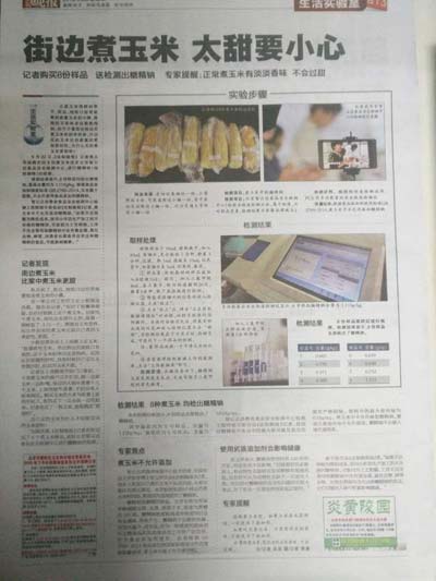 檢測結果:八個玉米樣品均含有糖精鈉,而國家標準中甜玉米是不得檢出糖精鈉,說明在外面購買甜玉米時很容易就會購買到含有糖精鈉的甜玉米,北京智云達提醒廣大消費者盡量少購買路邊攤甜玉米,最好選擇購買生玉米在家煮制,以保證食品的安全。