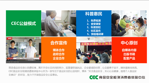 CEC食品安全檢測消費者體驗中心就是在這樣的食品安全大環境下成立的,自成立以來就面向廣大消費者進行食品安全等方面的科普宣教工作,針對社區居民、學生、幼兒、食品從業人士等不同群體打造不同形式的活動或課程內容,為普通消費者提供免費檢測服務,幫助大家對食品安全問題有正確認識,破解食品謠言,教大家勿信謠傳謠。成立至今,已免費接待消費者送檢食品達744次,成功開展384場公益活動,進學校開課程,進社區做活動。經過體驗中心團隊多次開發、修改、完善與實踐,確立了一套頗具特色的多感官教學模式,開設了針對中小學生的食品營養與安全科普課程,出版了《小學生食品營養與安全科普讀本-趣味科學小實驗》,開發了分別針對低幼和小學高年級、初中低年級的科學實驗包《食品安全趣味套裝-益智版》、《食品安全趣味套裝-探索版》。 利用 “視覺” “味覺” “嗅覺”等多“感官刺激”來引起學生興趣,利用多種形式的動手實驗,使學生對知識點有更直觀的認識和體驗幫助學生輕松學習食品安全及營養知識。未來,CEC體驗中心會將中小學生食品安全教育工作繼續推廣開來,惠及更多北京中小學生,以及全國各地的中小學生。