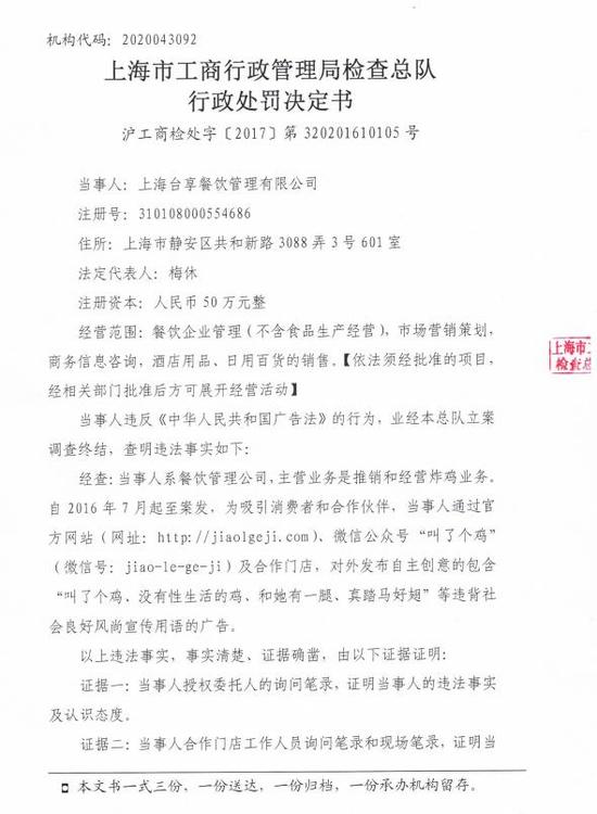 上海市工商行政管理局檢查總隊行政處罰書顯示,當事人系餐飲管理公司,主營業務是推銷和經營炸雞業務,自2016年7月起至案發,為吸引消費者和合作伙伴,當事人通過官方網站、微信公眾號“叫了個雞”及合作門店,對發布自主創意的包含“叫了個雞,沒有性生活的雞、和她有一腿、真踏馬好翅”等違背社會良好風尚用于的廣告。