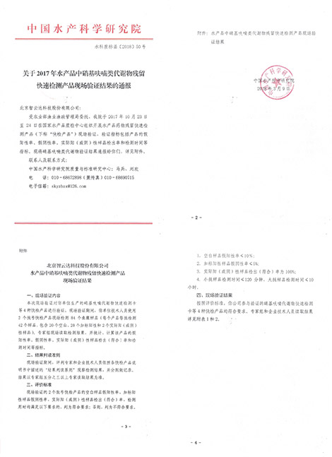 中國(guó)水產(chǎn)科學(xué)研究院質(zhì)量與標(biāo)準(zhǔn)研究中心受農(nóng)業(yè)部漁業(yè)漁政管理局委托 ,運(yùn)用智云達(dá)自主研發(fā)的水產(chǎn)品快檢產(chǎn)品,對(duì)水產(chǎn)品中硝基呋喃類(lèi)代謝物進(jìn)行快速檢測(cè)。2017年10月23日-24日,該檢測(cè)在國(guó)家水產(chǎn)品質(zhì)檢中心順利開(kāi)展。驗(yàn)證結(jié)果如下:
