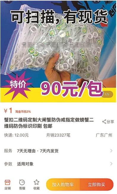 商家所售賣的防偽環大多都為橢圓形塑料圓環,一面印有陽澄湖大閘蟹地理標志產品專用標志圖案,另一面為二維碼。價格從一分到五分不等,買得越多越便宜。