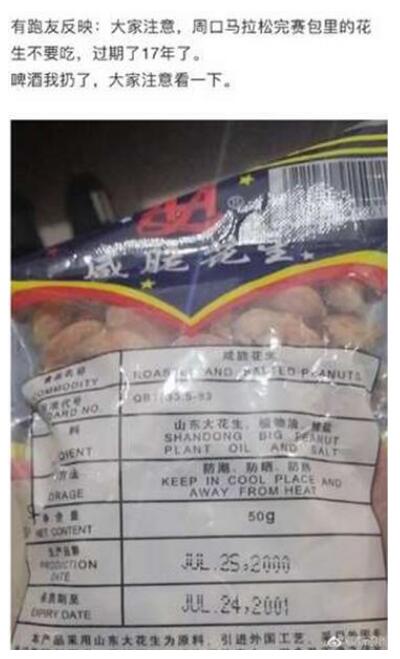 21日下午,北青報記者從周口馬拉松組委會了解到,出現錯誤的是該花生的外包裝袋,花生本身沒有問題。一位工作人員解釋,發放給選手的花生是周口本地一位老人炒制的花生,在當地非常有名,但一直是散裝出售,從來沒有包裝。周口馬拉松比賽時,組委會希望讓跑友品嘗當地美食,于是向該老人定做花生,“為了我們的賽事,他前幾天連夜加班趕制出來”,工作人員介紹。