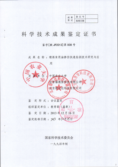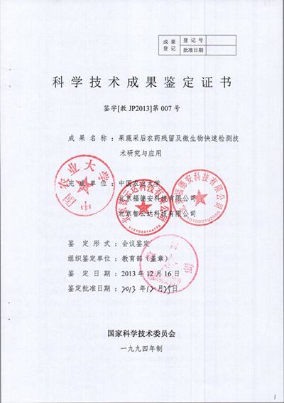 最終,智云達參與完成的“果蔬采后農藥殘留及微生物快速檢測技術研究與應用”、 “精煉食用油摻偽快速檢測技術研究與應用項目”順利通過教育部科技成果鑒定,教育部已于12月25日向完成單位及各位完成者頒發了科學技術成果鑒定證書,這是對智云達研發能力的極大認可,智云達將加倍努力研發更多、更好的產品以保障我國食品安全,使智云達真正成為行業研發的領導者和行業第一品牌。