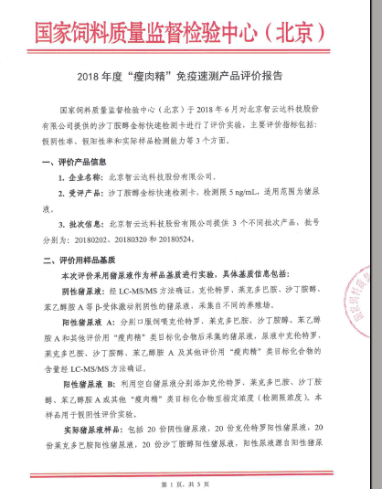 國(guó)家飼料質(zhì)量監(jiān)督檢驗(yàn)中心(北京)組織開展的“瘦肉精”免疫速測(cè)產(chǎn)品評(píng)價(jià)工作的結(jié)果近日公布,智云達(dá)報(bào)送的克倫特羅、萊克多巴胺、沙丁胺醇三種免疫檢測(cè)卡的假陰性率、假陽(yáng)性率、實(shí)際樣品檢測(cè)能力,均滿足評(píng)價(jià)指標(biāo)要求!