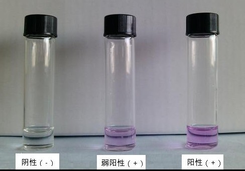 若溶液出現粉紅至紫紅色,則判為陽性(+);否則判為陰性(-);(有時溶液濃度較低,褪色較快,請在滴加樣品處理液時注意觀察)。