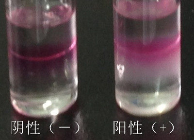 3.樣品檢測:另取一支0.5mL 吸管,吸取試劑C至吸管細(xì)部前端約1/4 處(約0.125mL),插入至試劑B瓶的下層溶液中并緩慢排空,觀察B瓶下層溶液中是否產(chǎn)生渾濁絮狀物或沉淀物。