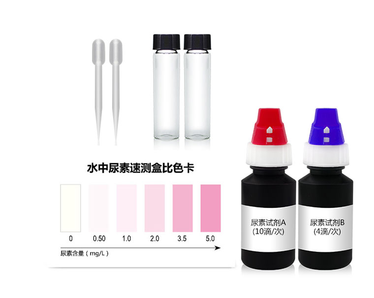 水中尿素在強酸性環境中,與檢測試劑沸水浴加熱條件下,生成紅色化合物,紅色越深,尿素含量越高。