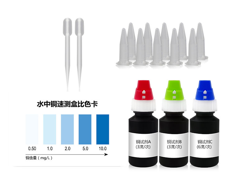 水中銅與檢測試劑反應生成藍色化合物,含量越高藍色越深。