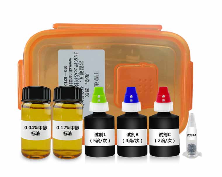 甲醇和乙醇在色澤與味覺上沒有差異,酒中微量甲醇可引起人體慢性損害,高劑量時可引起人體急性中毒。我國發生的多次酒類中毒,都是因為飲用了含有高劑量甲醇的工業酒精配制的酒或是飲用了直接用甲醇配制的酒而引起。國家食品衛生標準規定:以糧食為原料的蒸餾酒或酒精勾兌的白酒中甲醇含量應≤ 0.04g/100ml;以薯干及代用品為原料的蒸餾酒中甲醇含量應≤ 0.12g/100ml。本速測盒適用于蒸餾酒中微量(0.02% 以上)甲醇的現場快速測定,也適用于經過重新蒸餾的配制酒(以發酵酒、蒸餾酒或食用酒精,添加糖、色素、香料、果汁配成的酒,或以食用酒精浸泡植物的根、莖、葉、果實等配制的酒)中微量甲醇的快速測定。