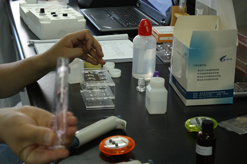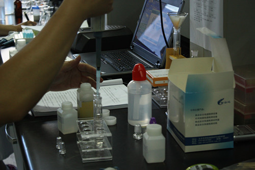 4、 取兩根試管,分別作為樣品管和對照管。在樣品管加入3ml樣品液,在對照管中加入3ml緩沖液,隨后分別加入20ul顯色劑和50ul酶試劑。蓋塞混勻靜置10min。