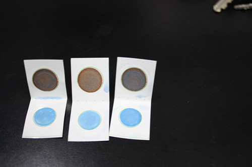 2、取農(nóng)藥殘留檢測卡,將西紅柿樣品提取液的液滴滴在白色藥片上,放置 10min 進(jìn)行預(yù)反應(yīng),預(yù)反應(yīng)后的藥片表面必須保持濕潤。