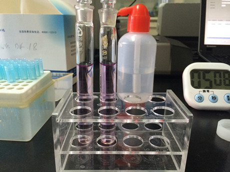 3、取一支10mL比色管,加入1mL樣品液,取一空白管內(nèi)加入蒸餾水替代樣品液,分別加入C溶液80μL,加蒸餾水至10mL刻度線,加入D溶液0.5mL,搖勻,開蓋靜置10min。