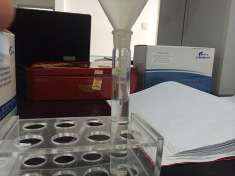 3、樣品管:取制備好的樣品液加入A溶液1mL,搖勻,加入三氯甲烷4mL,蓋上塞子,較為快速顛倒20次,靜置5min,取下層溶液進行檢測。
