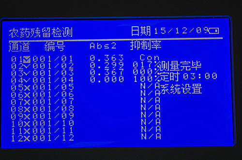 檢測結(jié)果如圖所示,結(jié)果以酶被抑制的程度,即抑制率表示。當(dāng)果蔬樣品提取液對酶的抑制率為40~50%時(shí),則表明被測樣品為可疑農(nóng)殘超標(biāo)樣品;當(dāng)抑制率≥50%時(shí),表示蔬菜中有高劑量有機(jī)磷或氨基甲酸酯類農(nóng)藥存在,樣品為陽性結(jié)果。
