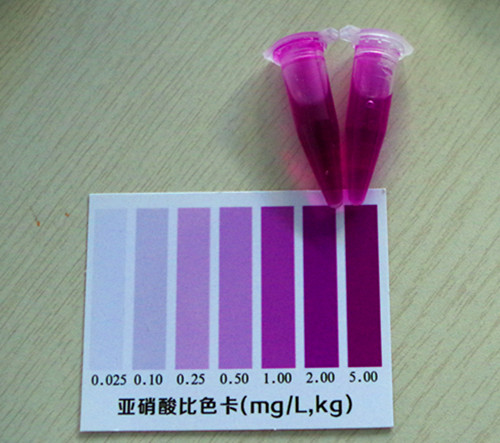 加入2滴試劑2搖勻靜置10分鐘后與標準比色卡對比,該比色卡上的數值乘上10即為樣品中亞硝酸鹽的含量mg/kg(以NaNO2計)。