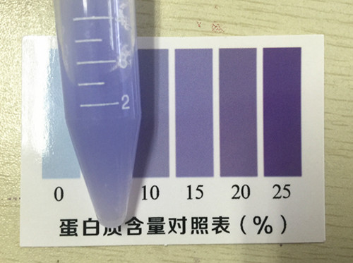 取4 mL顯色液加入比色管中,蓋上蓋,用力將奶粉全部搖溶,顯色3分鐘,在3~5分鐘內將比色管襯在白紙上與標準比色卡進行對比,找出與乳粉蛋白質標準比色卡上相近的色階,即為每100g乳粉樣品中蛋白質的含量。