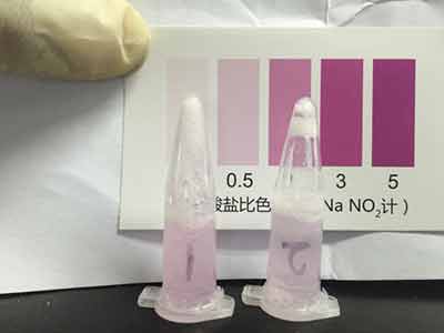 加入2滴試劑1,搖勻后靜置5分鐘。加入2滴試劑2搖勻靜置10分鐘后與標準比色卡對比,該比色卡上的數值即為樣品中亞硝酸鹽的含量mg/kg(以NaNO2計)。