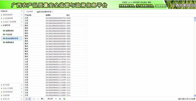 自治區對所有可追溯的農產品加施賦有防偽追溯碼的追溯標識。依據統一的編碼規則,可通過本系統對農產品的防偽追溯碼進行管理。