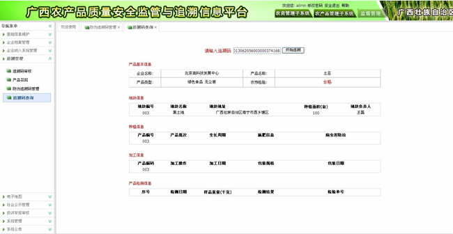 監管部門根據輸入的追溯碼查詢出該追溯碼的產品基本信息。產品類型即是否是三品一標的產品。還包括產品更詳細的信息,如地塊、種植、加工和檢測數據結果等。讓監管部門追溯產品的所以相關信息。如該產品出現問題,方便監管部門獲取詳細資料。便于管理。如圖4-1所示