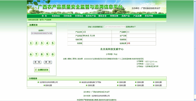 本系統是自治區農產品質量安全信息統一查詢和發布的平臺,根據追溯碼,消費者能夠通過短信、電話、網上查詢等方式,快捷地查詢到農產品全程的質量安全信息。企業農產品溯源信息顯示界面可定制。